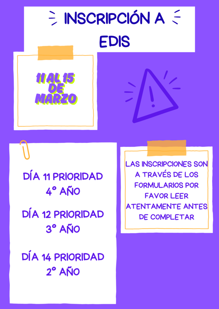 ES MUY IMPORTANTE COMPLETAR EL FORMULARIO DENTRO DE LA FECHA DE INSCRIPCIÓN, SI TENÉS DUDAS O NECESITAS AYUDA PARA COMPLETARLO ACERCARTE A PRECEPTORÍA DENTRO DE LAS FECHAS ESTABLECIDAS PARA LA INSCRIPCIÓN.
