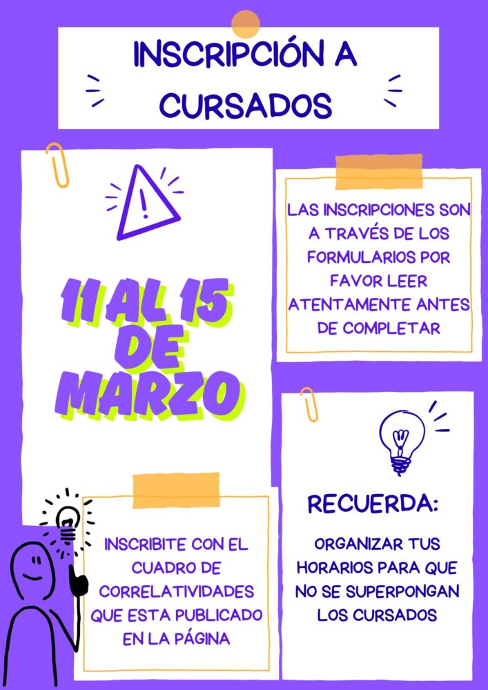 ¿Cómo se inscriben a cursados? Completando un Formulario online que se habilitarán durante las fechas establecidas. Para ello deberán hacer clic en los siguientes enlaces según año/carrera: